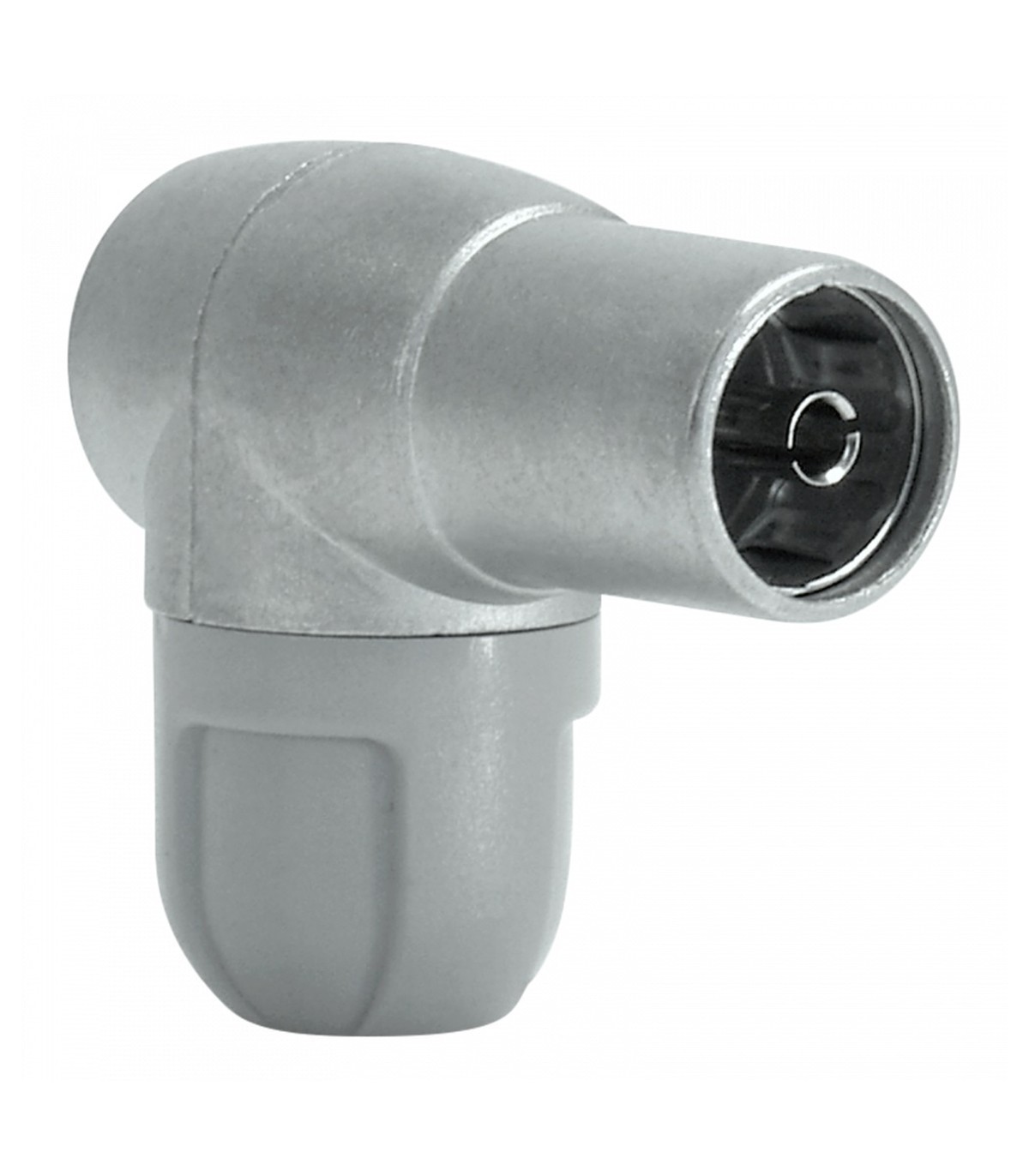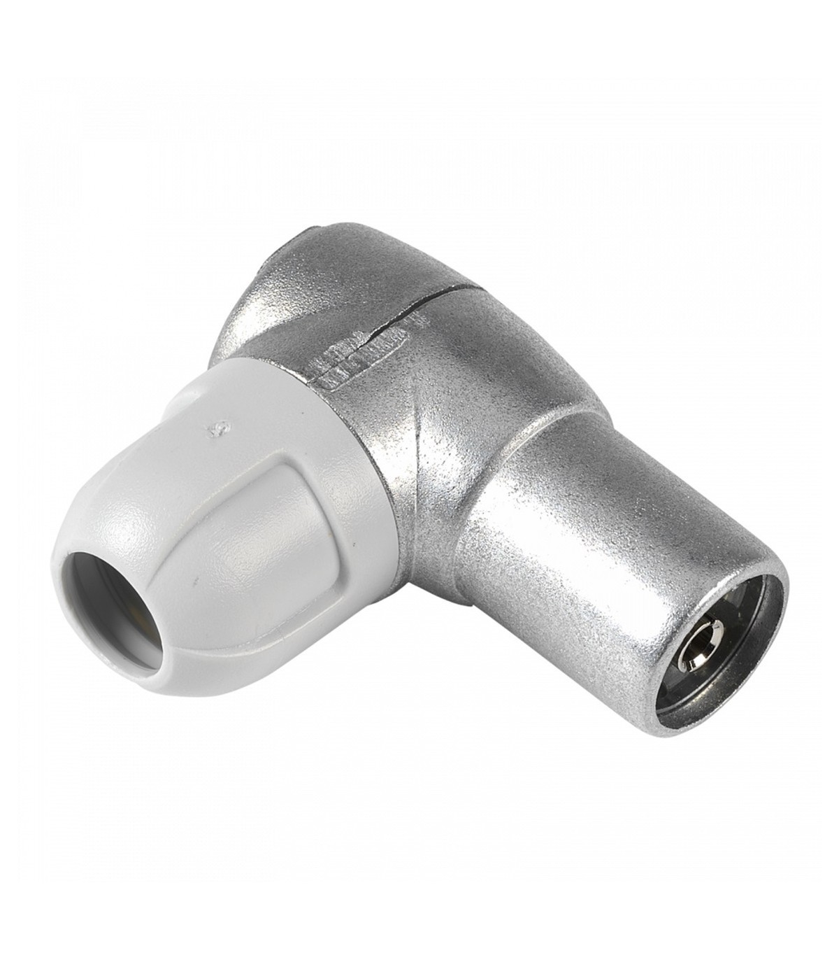 Conector hembra CEI con forma de codo para cables de antena TV. Tiene un sistema de montaje por piezas, no se necesitan herramientas para su instalación. El conector se desmonta para poder insertar el vivo, quedando fijo al volver a montar las piezas. Es compatible con cables coaxiales de 5 a 6.9 mm de diámetro y proporciona un buen blindaje frente a interferencias, gracias a su construcción en Zamak.