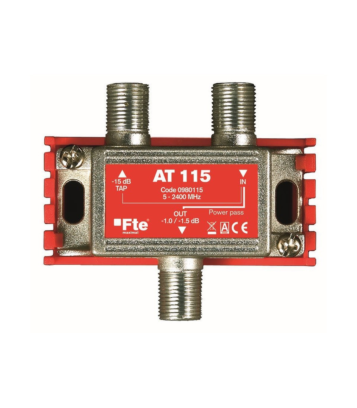 Derivador con conectores tipo F de 1 entrada, 1 salida y 1 derivación, para señales de terrestre y satélites comprendidos entre las bandas de 5-2400MHz. Tiene una atenuación de derivación de 15/16.5dB y una atenuación de paso de 1/1.6dB. Permite el paso de corriente entrada-salida. También incluye un soporte de plástico para el montaje.