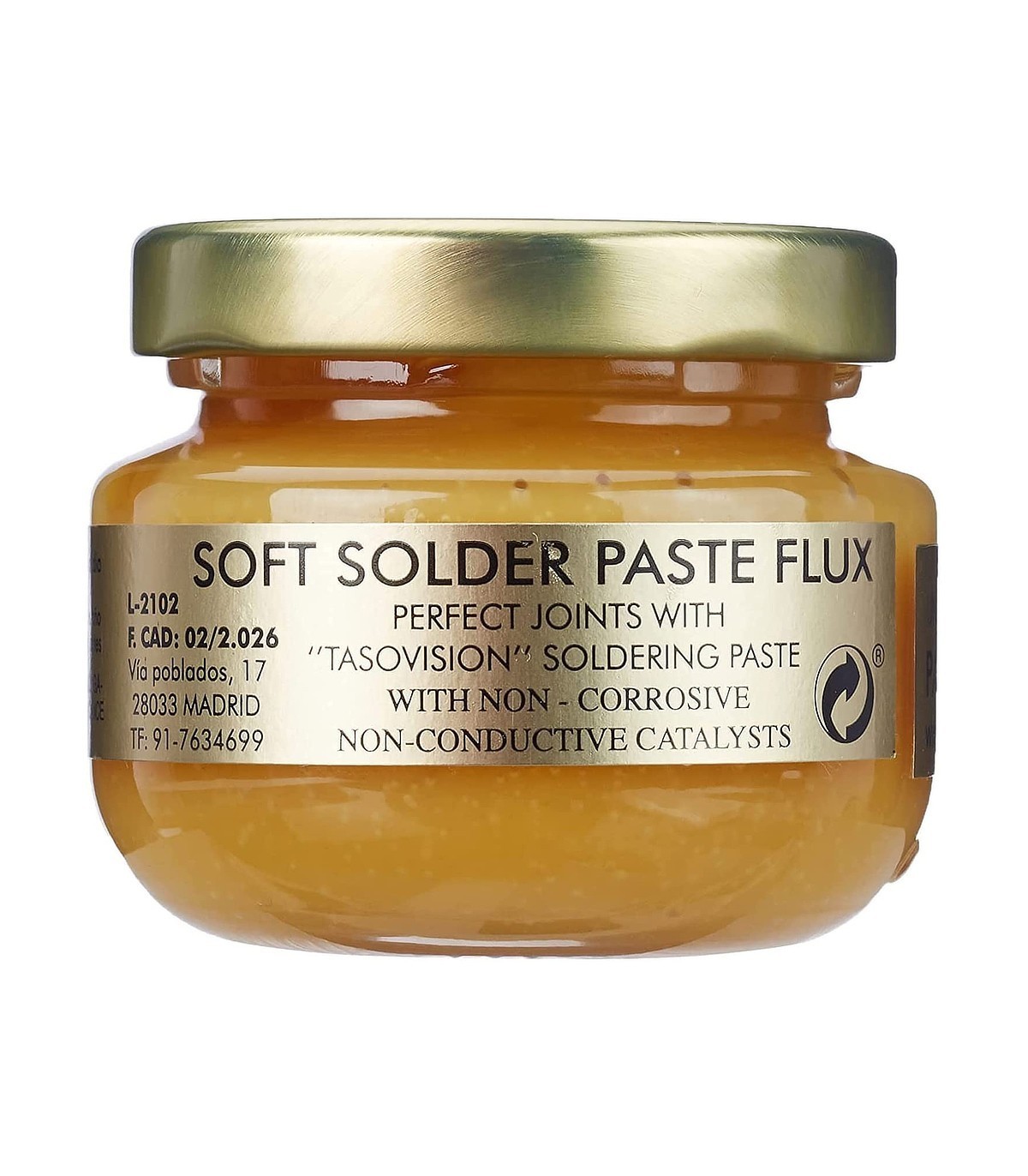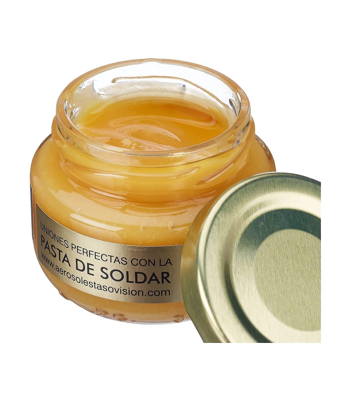 Pasta de soldar y desoldar presentada en un recipiente de cristal de 50cc. Contiene catalizadores no corrosivos ni conductivos.