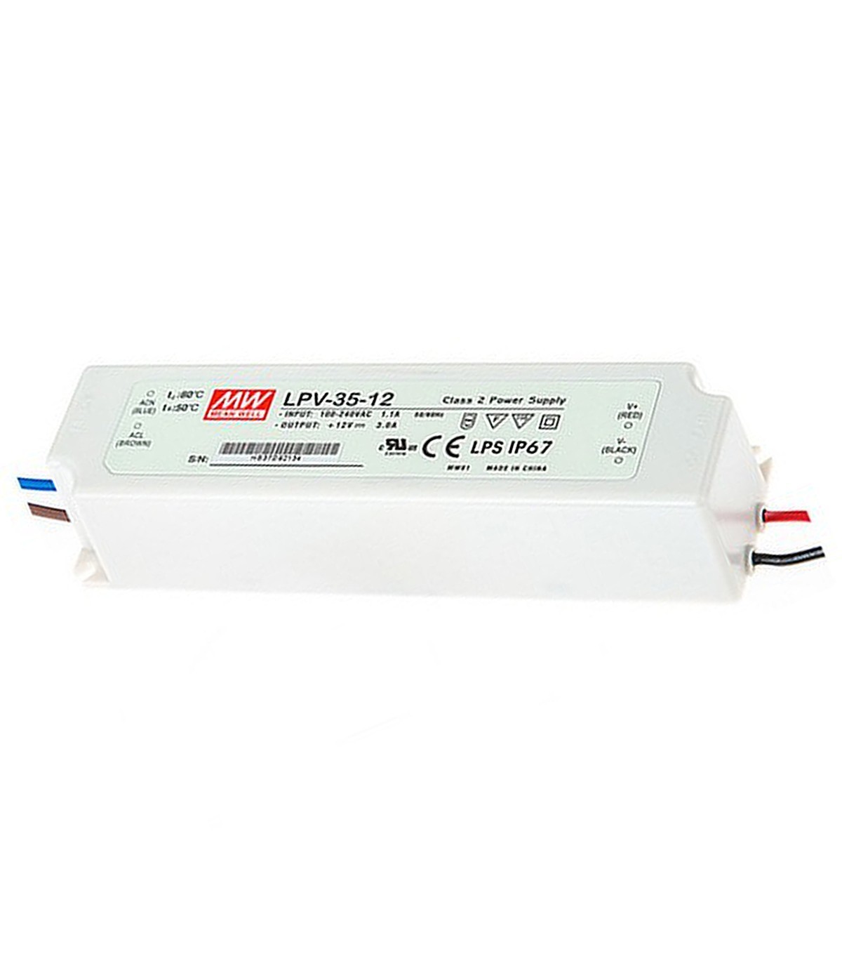 Fuente de alimentación estanca IP67 de salida única AC-DC con voltaje constante; una salida de 12VDC con rango de intensidad de 0-3A según demande la carga y una potencia de salida de 36W. Esta fuente pertenece a la serie LP de Mean Well, son equipos que se alimentan en tensión constante. Presenta una carcasa de plástico estanca para protegerla de la intemperie.