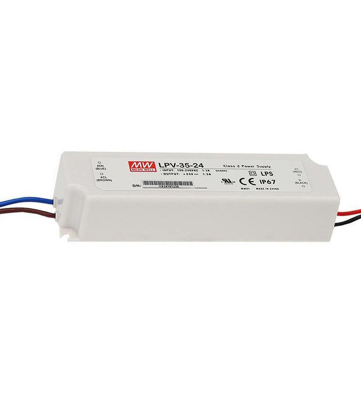 Fuente de alimentación estanca IP67 de salida única AC-DC con voltaje constante; una salida de 24VDC con rango de intensidad de 0-1.5A según demande la carga y una potencia de salida de 36W. Esta fuente pertenece a la serie LP de Mean Well, equipos que se alimentan en tensión constante. Presenta una carcasa de plástico estanca para protegerla de la intemperie.