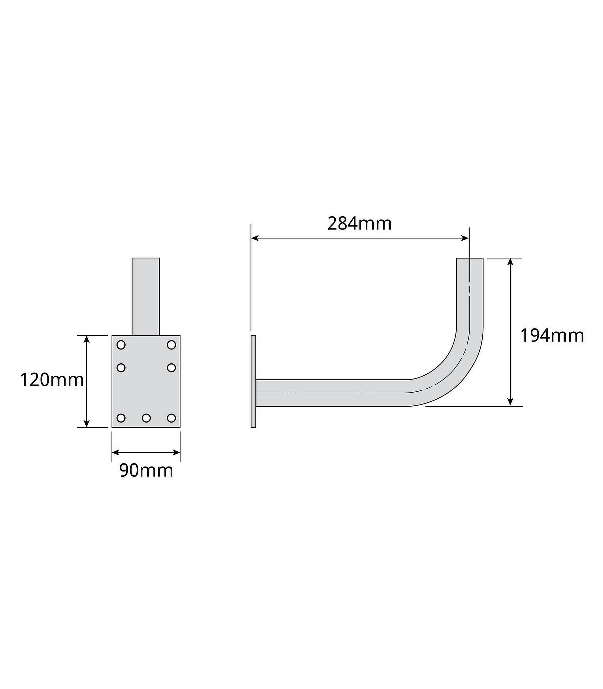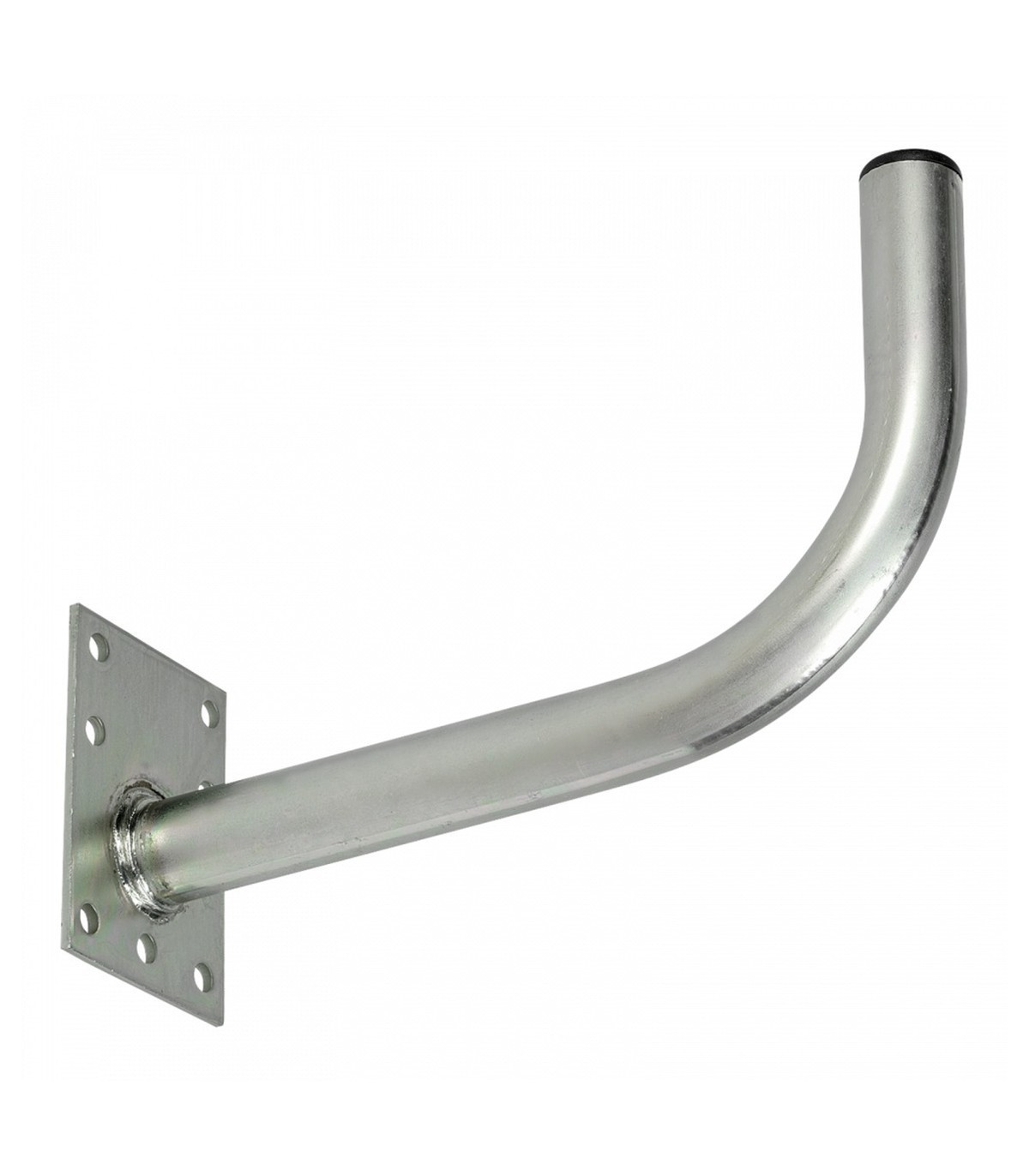 Soporte para instalaciones de antenas. Tiene forma tubular en “L” con 35mm de diámetro, una separación de la pared de 284mm y una altura de 194mm. Su instalación se hace principalmente atornillándolo en la pared, o también se puede fijar en mástiles o barandillas a través de bridas compatibles, por medio de la pletina de 120x90mm del soporte. Este soporte es compatible con las antenas de parábola ISD de 60cm de diámetro. También incluye un tapón negro en el tubo, para proteger el interior del soporte de la acumulación de agua. Está fabricado en acero y presenta una gran resistencia a la corrosión, gracias a su tratamiento dual de galvanizado y recubrimiento protector reactivo (RPR).