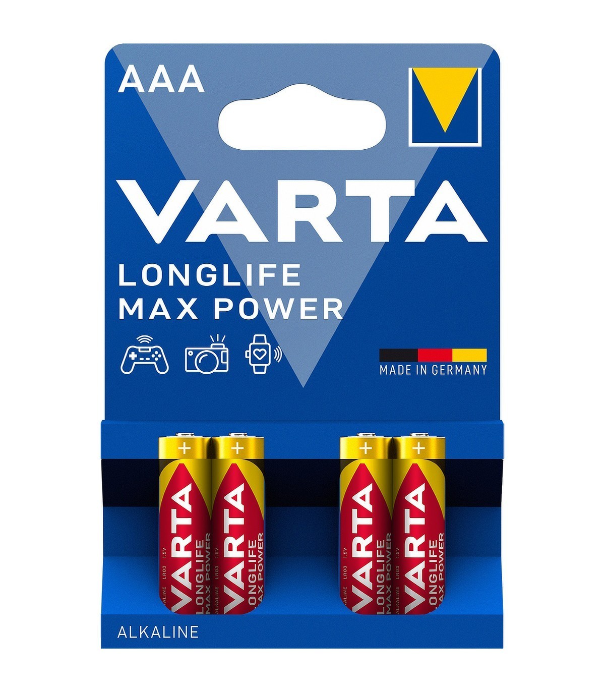 Pila alcalina de tamaño AAA de 1.5V, también denominada LR03, de la marca Varta con tecnología Longlife Max Power, que ofrece una precisión insuperable con niveles flexibles de energía para los dispositivos que necesitan una energía precisa en función de las necesidades.