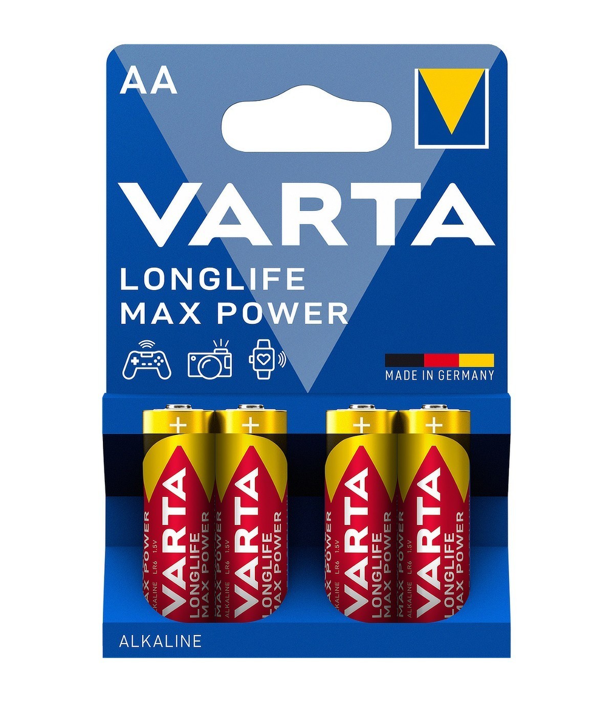 Pila alcalina de tamaño AA de 1.5V, también denominada LR6, de la marca Varta con tecnología Longlife Max Power, que ofrece una precisión insuperable con niveles flexibles de energía para los dispositivos que necesitan una energía precisa en función de las necesidades.
